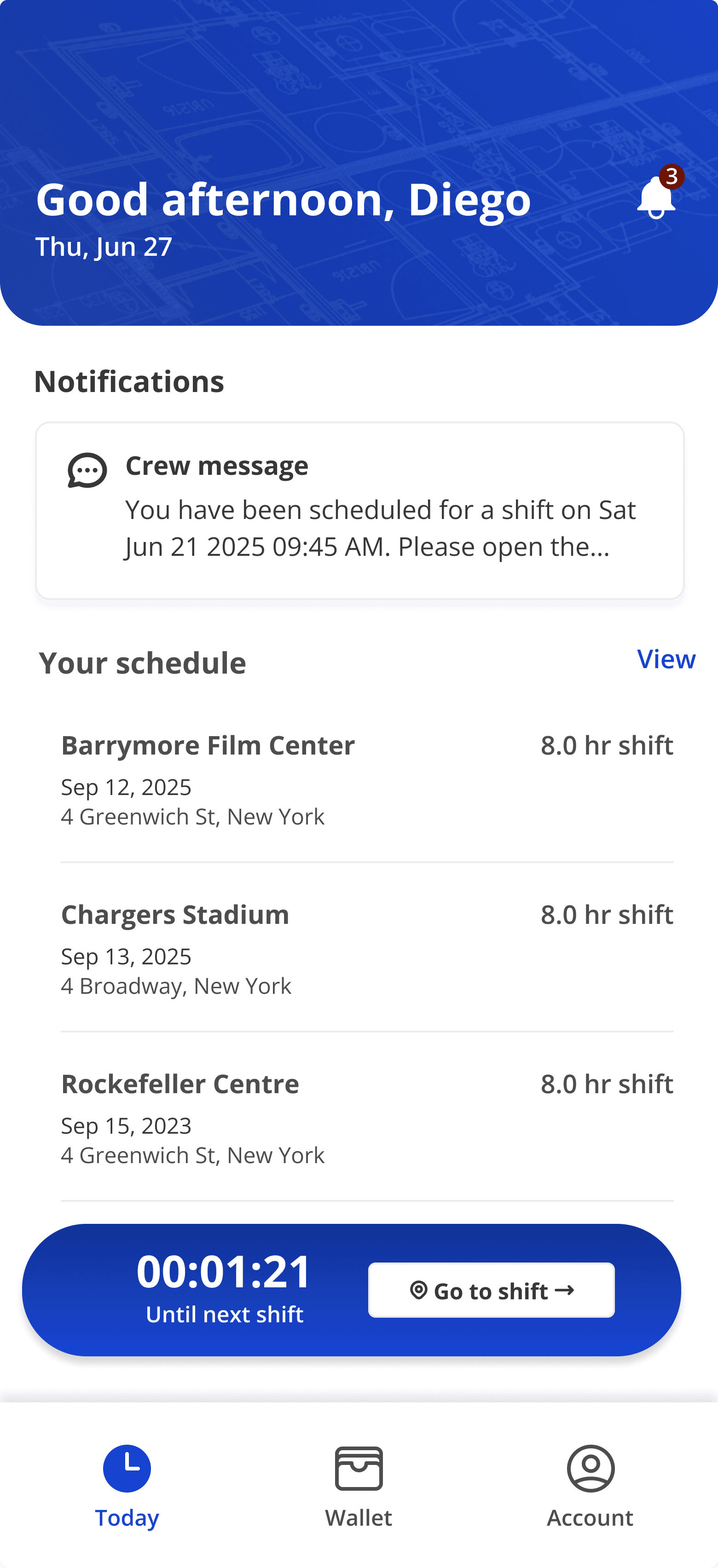 The app shows current and upcoming shifts, past work history, and messages from the office or foreman so crews stay aligned with jobsite plans.