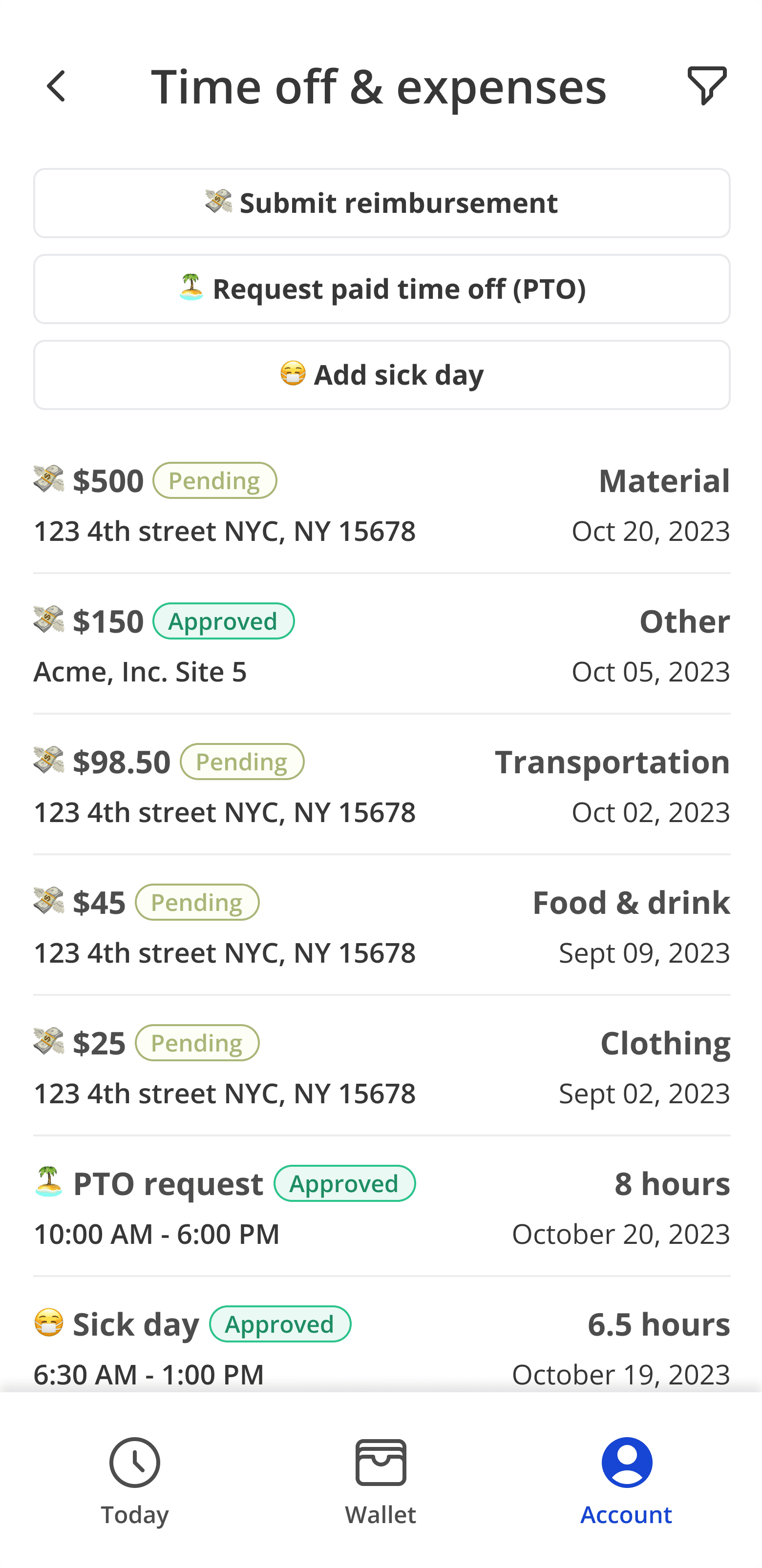 Workers can submit PTO, sick leave, and reimbursement requests directly through the app.