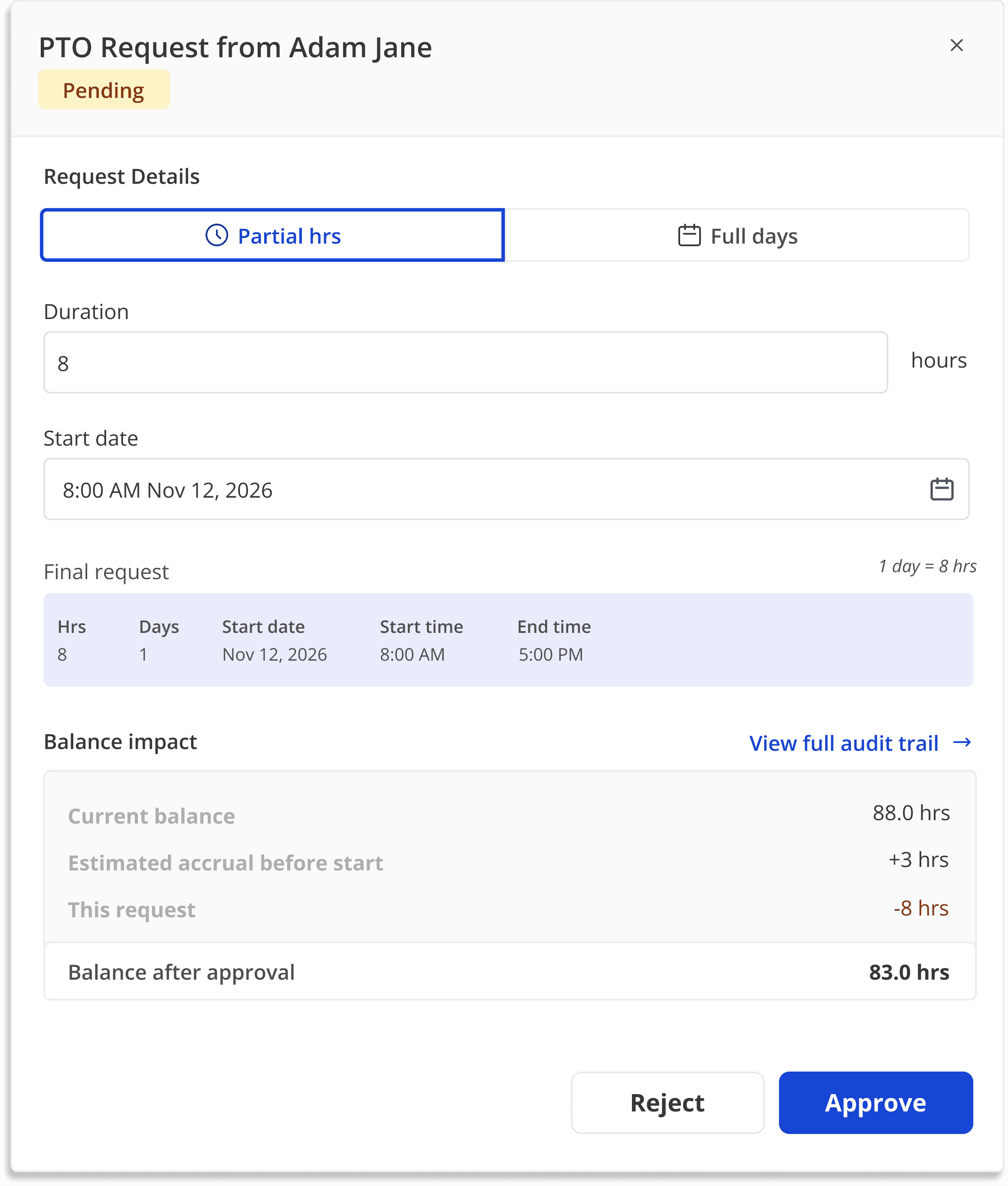 Managers can review requests, see available balances, and track time already taken before approving time off.