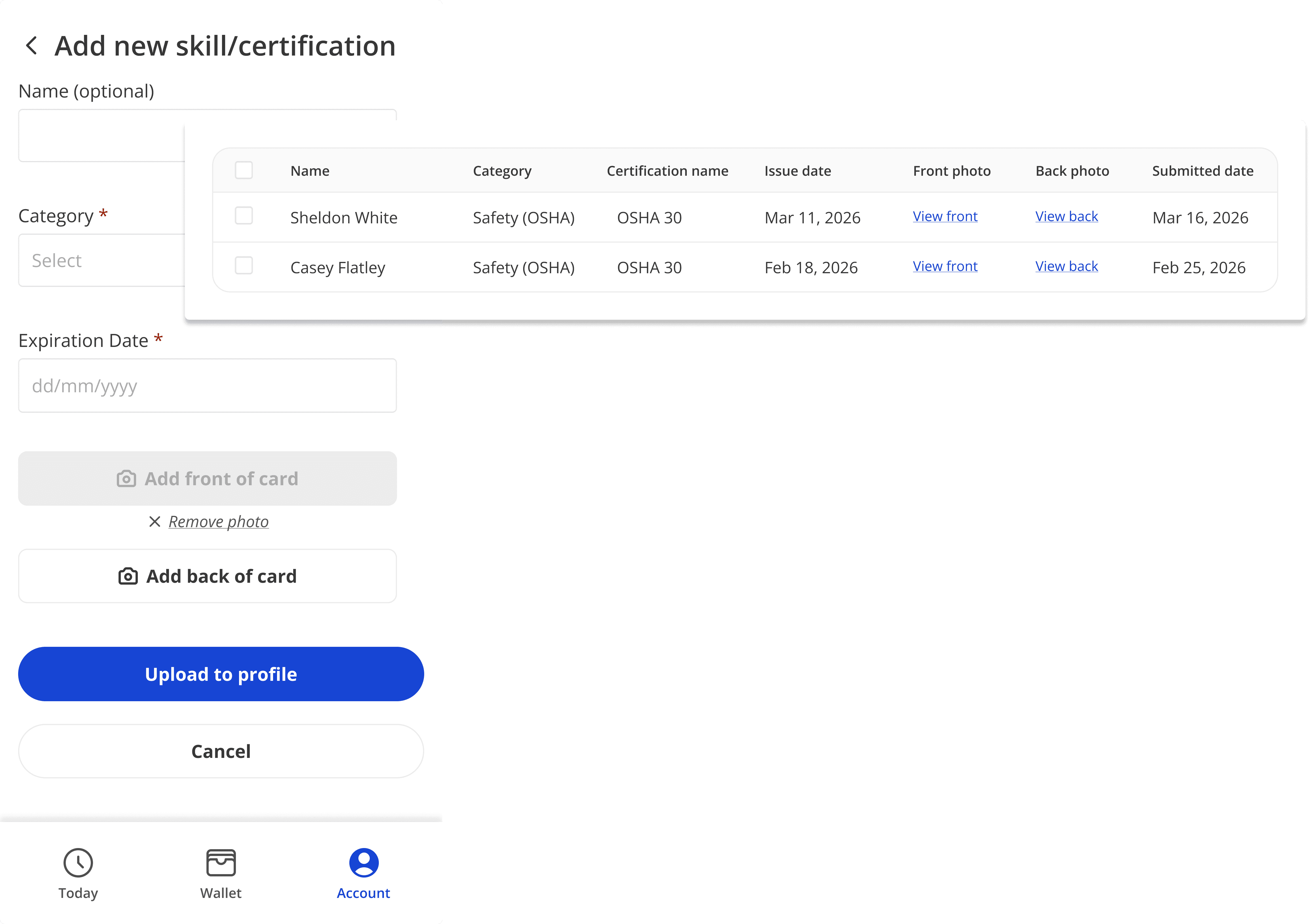 Workers upload documents directly from their phone, and Trayd uses OCR technology to capture key details like issue and expiration dates automatically.