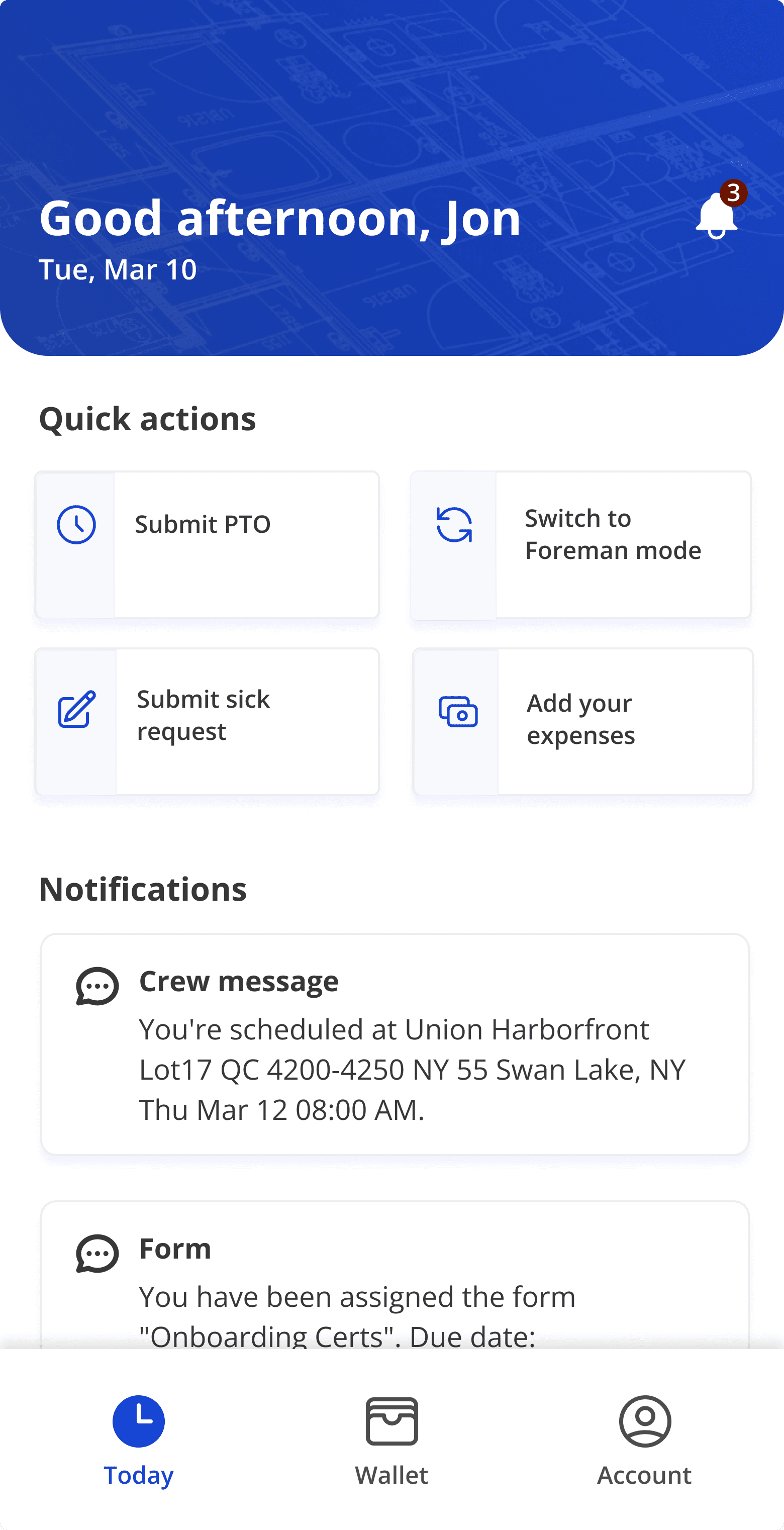 Workers receive messages through text and mobile notifications so updates reach them wherever they are — whether on a jobsite, in transit, or at home.